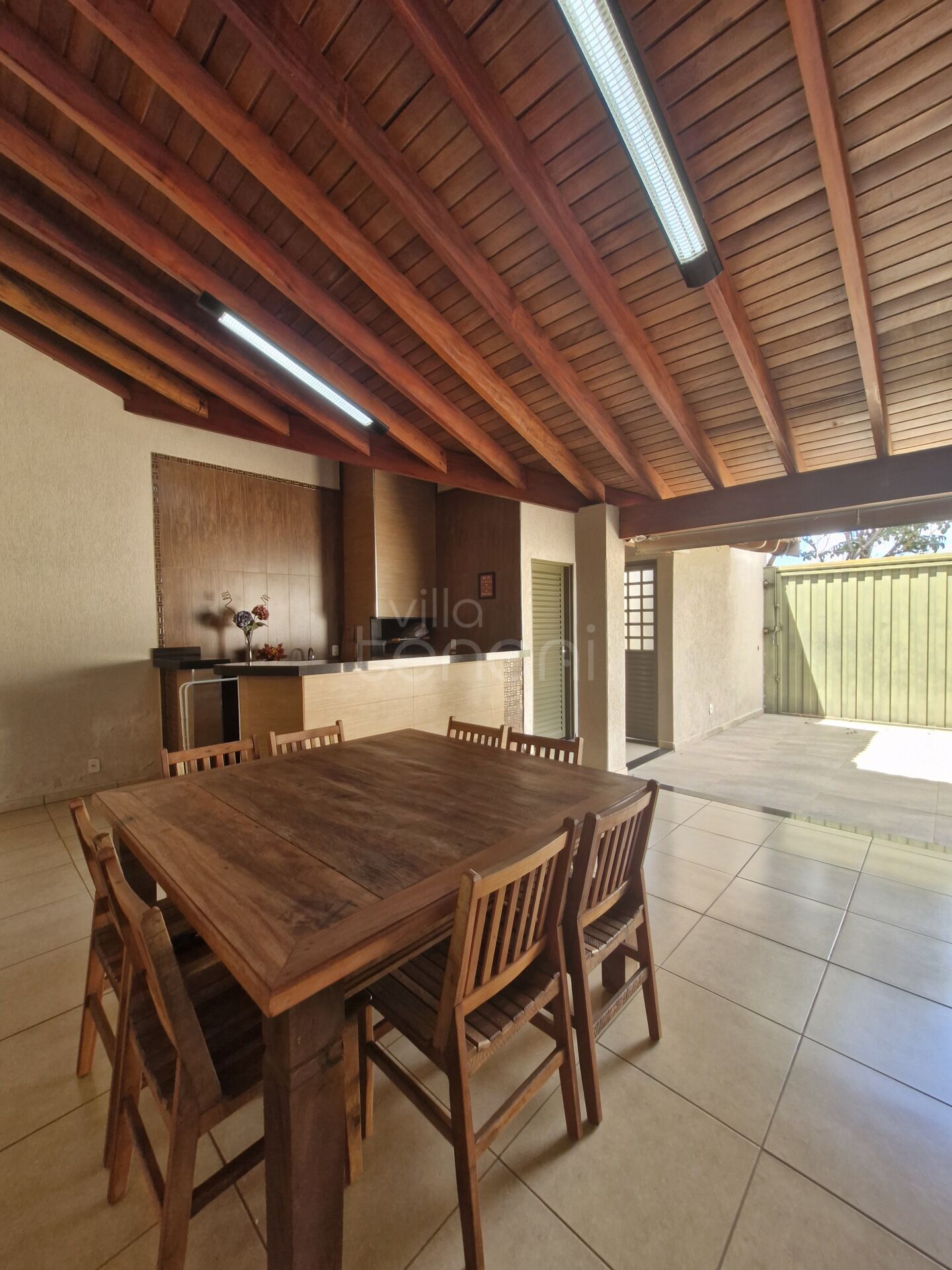 Varanda ampla nos fundos com área de churrasco, banheiro externo e vista para quintal,