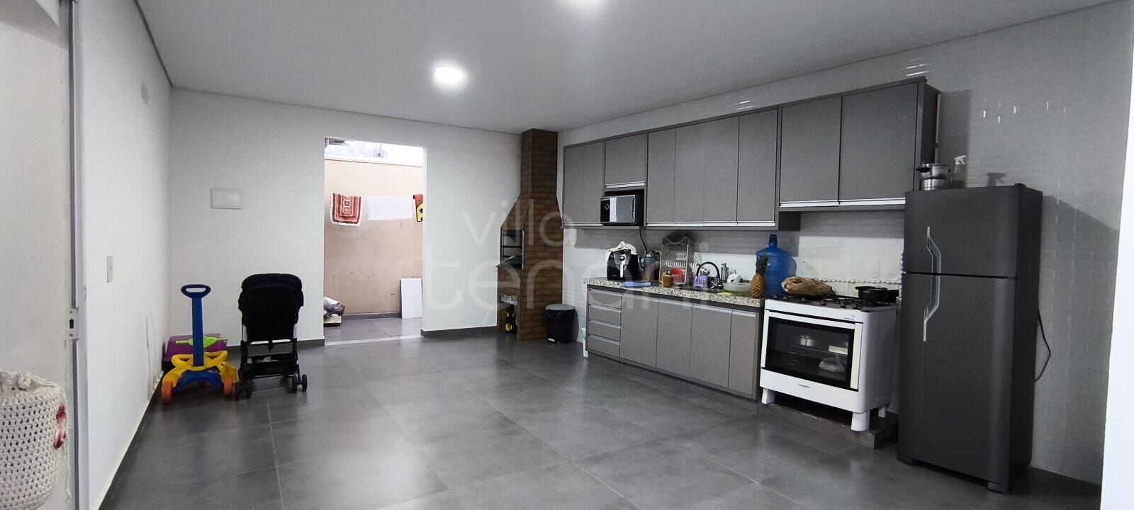 Cozinha gourmet com armários planejados e churrasqueira,